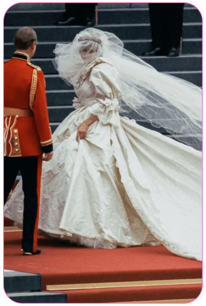 It’d be criminal not to include the wedding dress on this list. The dress, designed by David and Elizabeth Emanuel, was a work of art. Hand-decorated with mother-of-pearl sequins and about 10,000 pearls, with its puff sleeves, ruffled neckline, and ball gown silhouette, it really played into the whole “fairytale” story that was making its rounds in the press.